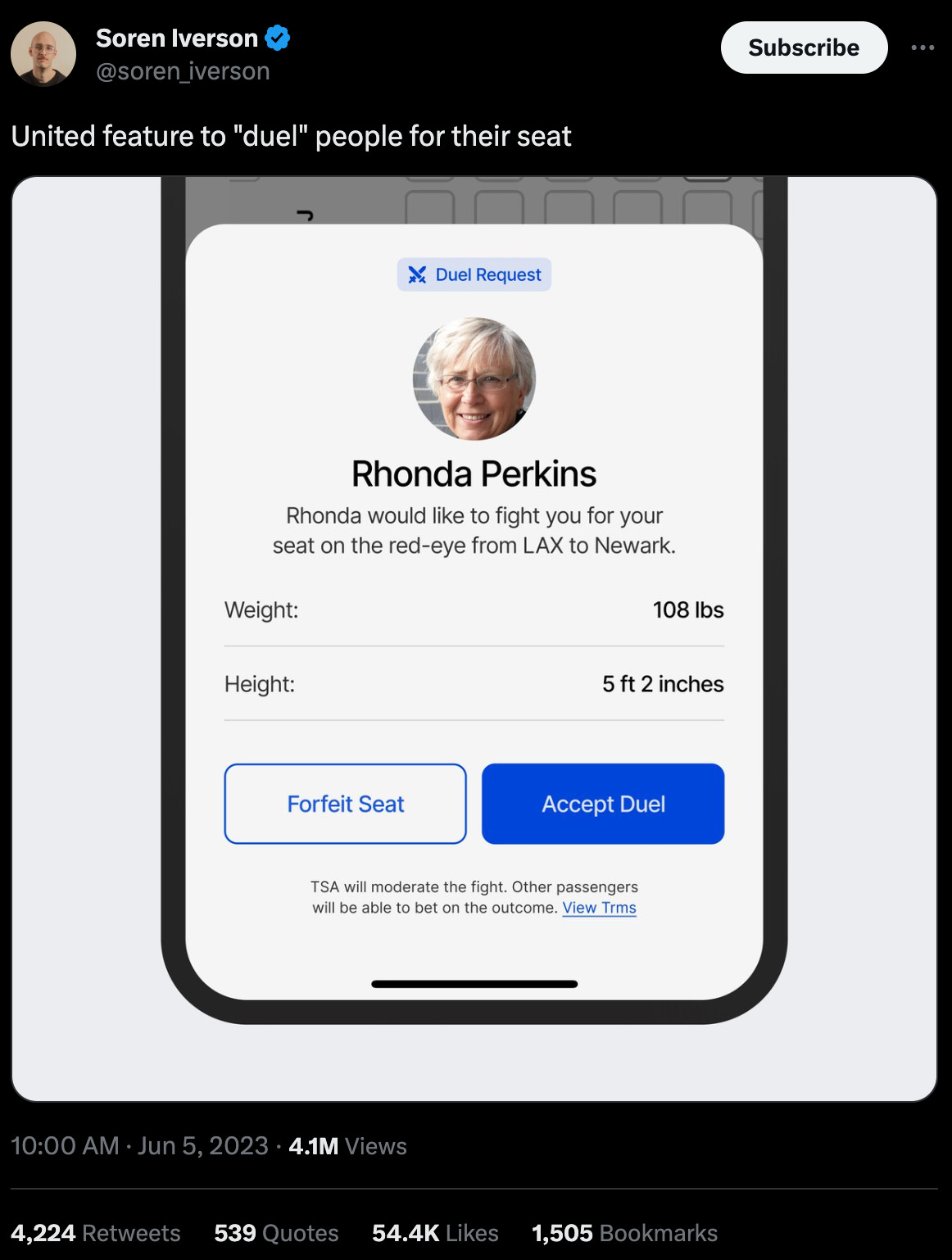 It’s time to bring back duels. What better place to run a test than in the airport? People are tired, desperate, and angry - a perfect combo to bring out our worst. I think it would be a perfect system for Southwest’s open seating - duels could simply take place in line outside the plane. If you like this, the creator Soren puts out a new UI design type of joke every day, so give him a follow!